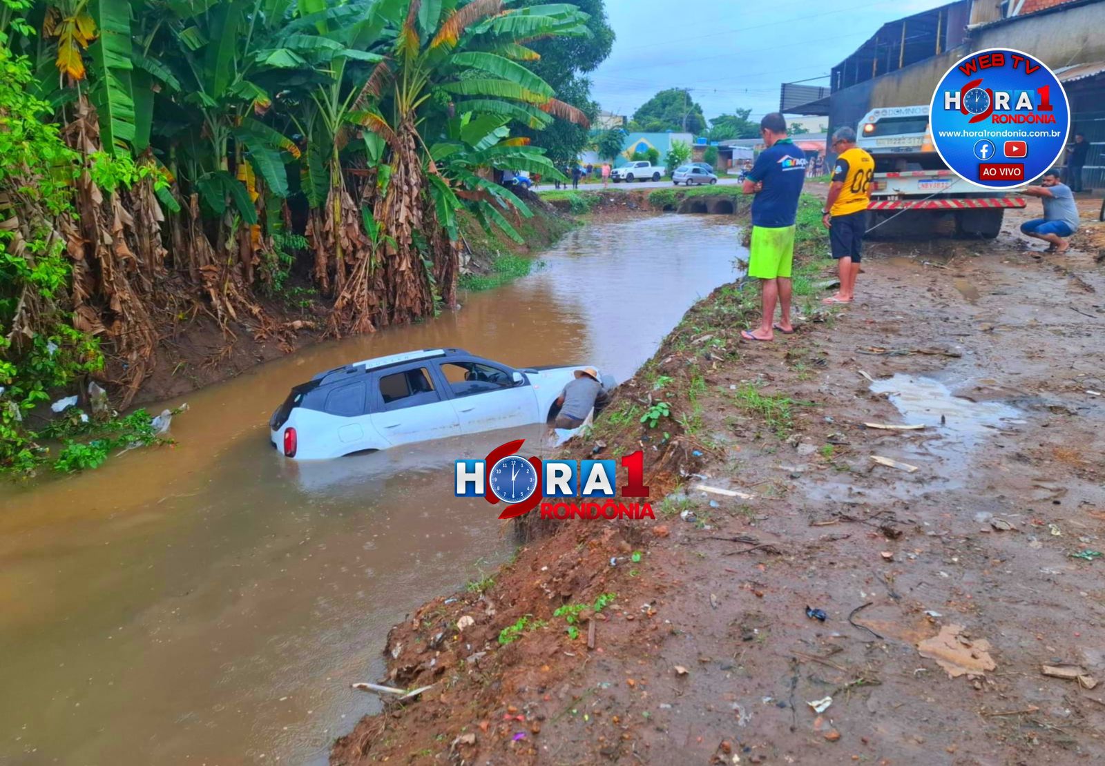DESESPERO NA CHUVA: Carro é arrastado por córrego, fica submerso e mãe e filha escapam da morte em Porto Velho