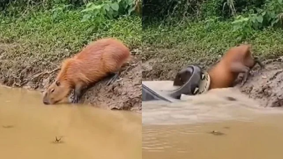 Imagem impressionante de capivara sendo surpreendida por sucuri durante ataque às margens de rio
